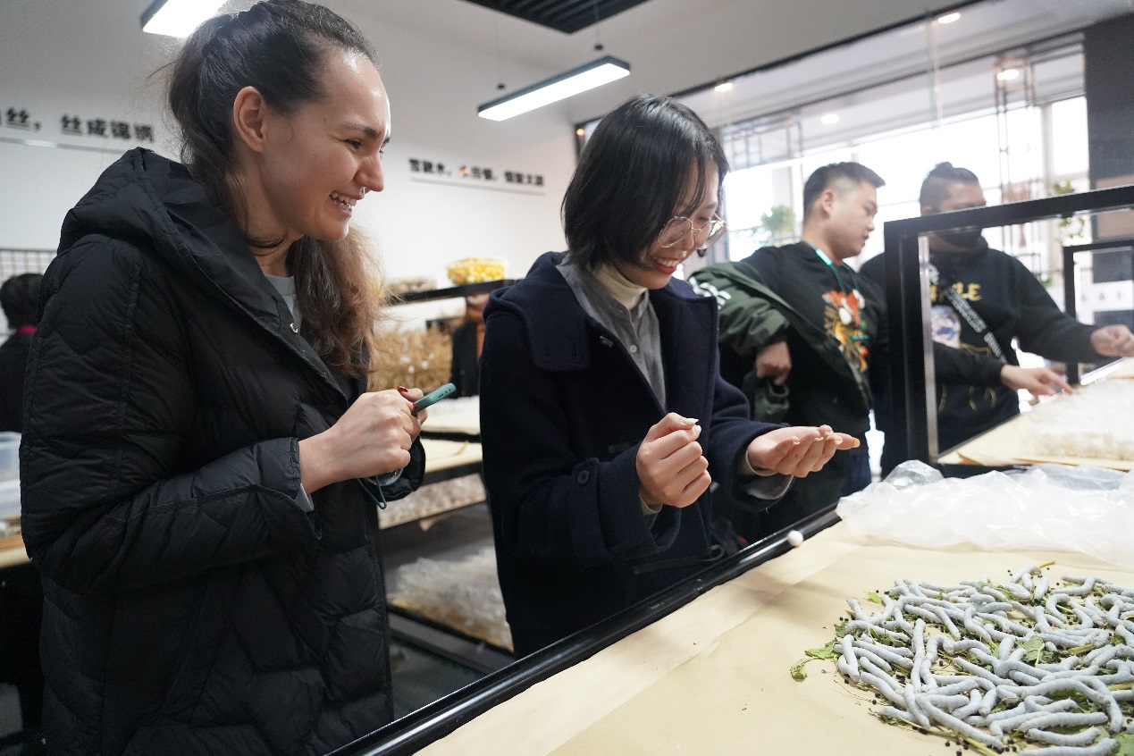 In the special IP of the Cultural Park: "Silkworm Breeding Class", the international students interact with the "baby silkworm" in a close distance, and explore the cultural symbols behind the silkworm. Later, with the staff's careful explanation, the students visited and learned about the silk weaving process.The machines and weaving models on display vividly restore the process of hand-weaving silk in ancient times. The students also experienced the manufacturing techniques of silk drawing and cotton stripping, and felt the silk quilt made of 20,000 cocoons. The smooth and skin-friendly texture impressed the students with the traditional Chinese weaving skills and the wisdom of the ancient labors.