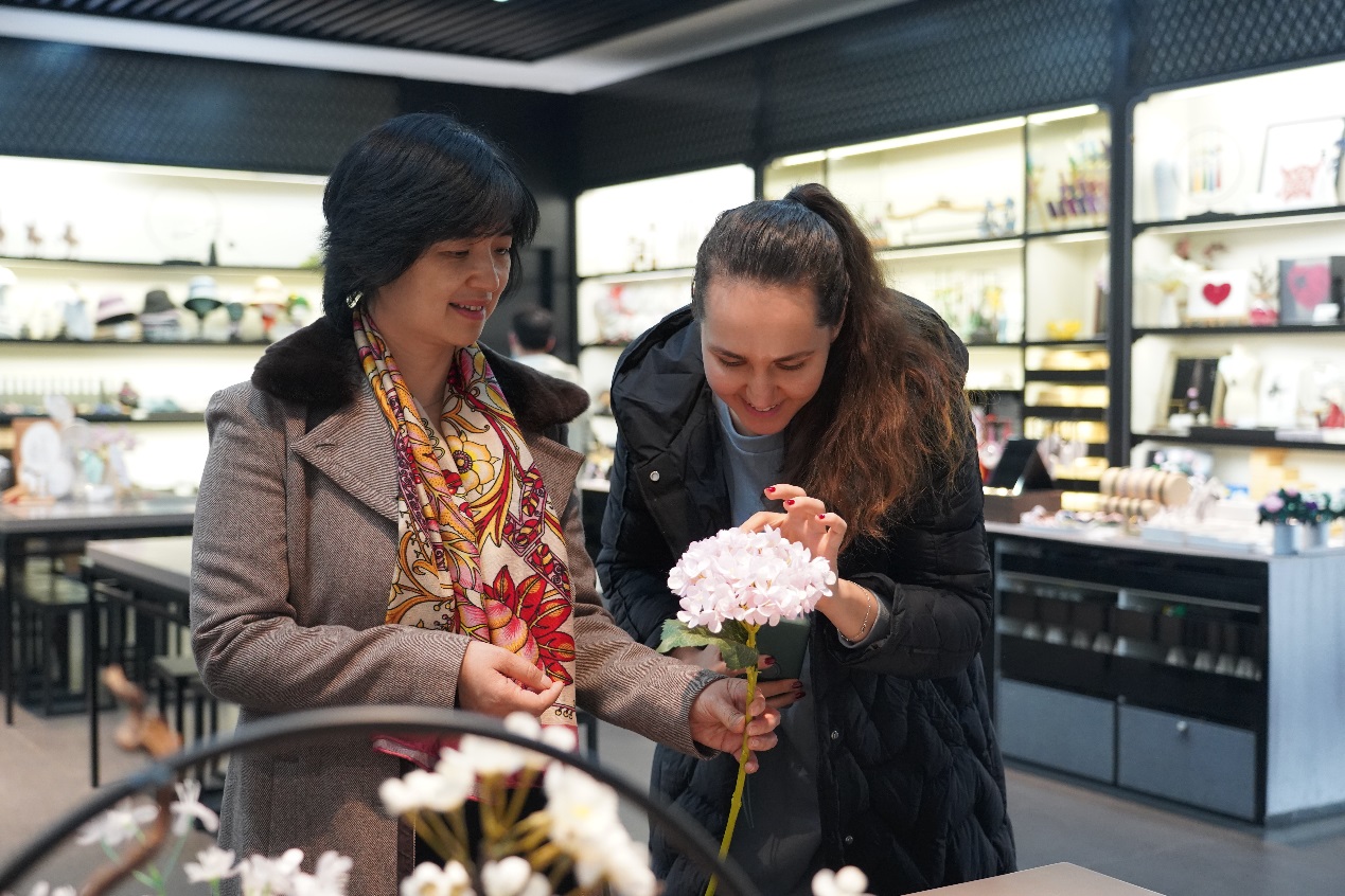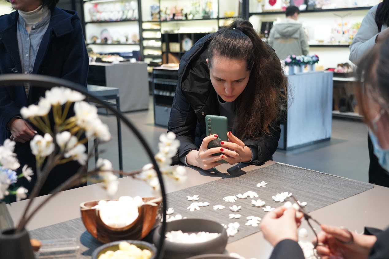 Finally, the staffs led the students to the Taihu Snow Cultural Innovation Hall. Handmade cocoon flowers, masks, silk scarves, hair bands, hand-embroidered fans and other cultural and creative products made from silkworm cocoonslooked dazzling and exquisite. The students finished the visit in appreciation of cultural products and by tasting mulberry leaf tea.