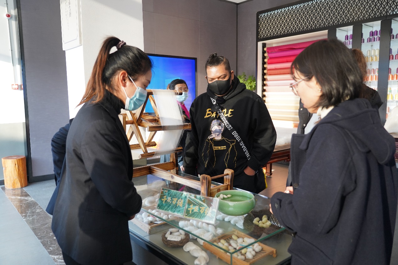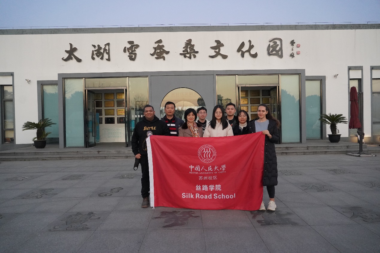 On December 21st, Prof. Jiang Xiaoli, Deputy Dean of Silk Road School led a team to Zhenze Town, thebeautiful shore of Taihu Lake and the hometown of silk quilts, to visit Taihu Snow Sericulture Culture Park, and to learn about silkworms. Learning about silk production included knowledge of breeding and silk weaving technology, understand the origin of silk culture and development of the "Silk Road". Silk Road School international students from Bangladesh, Russia and other countries participated in this educational trip.
