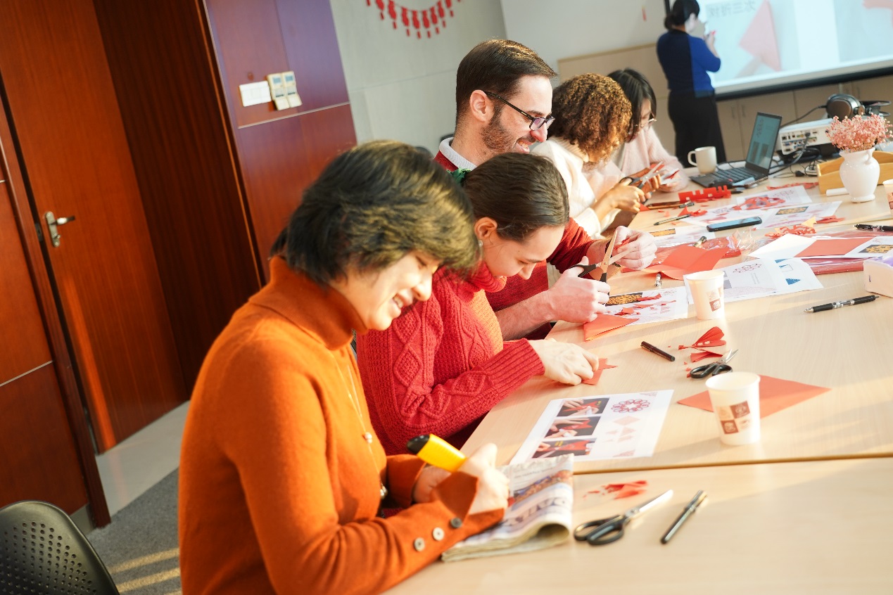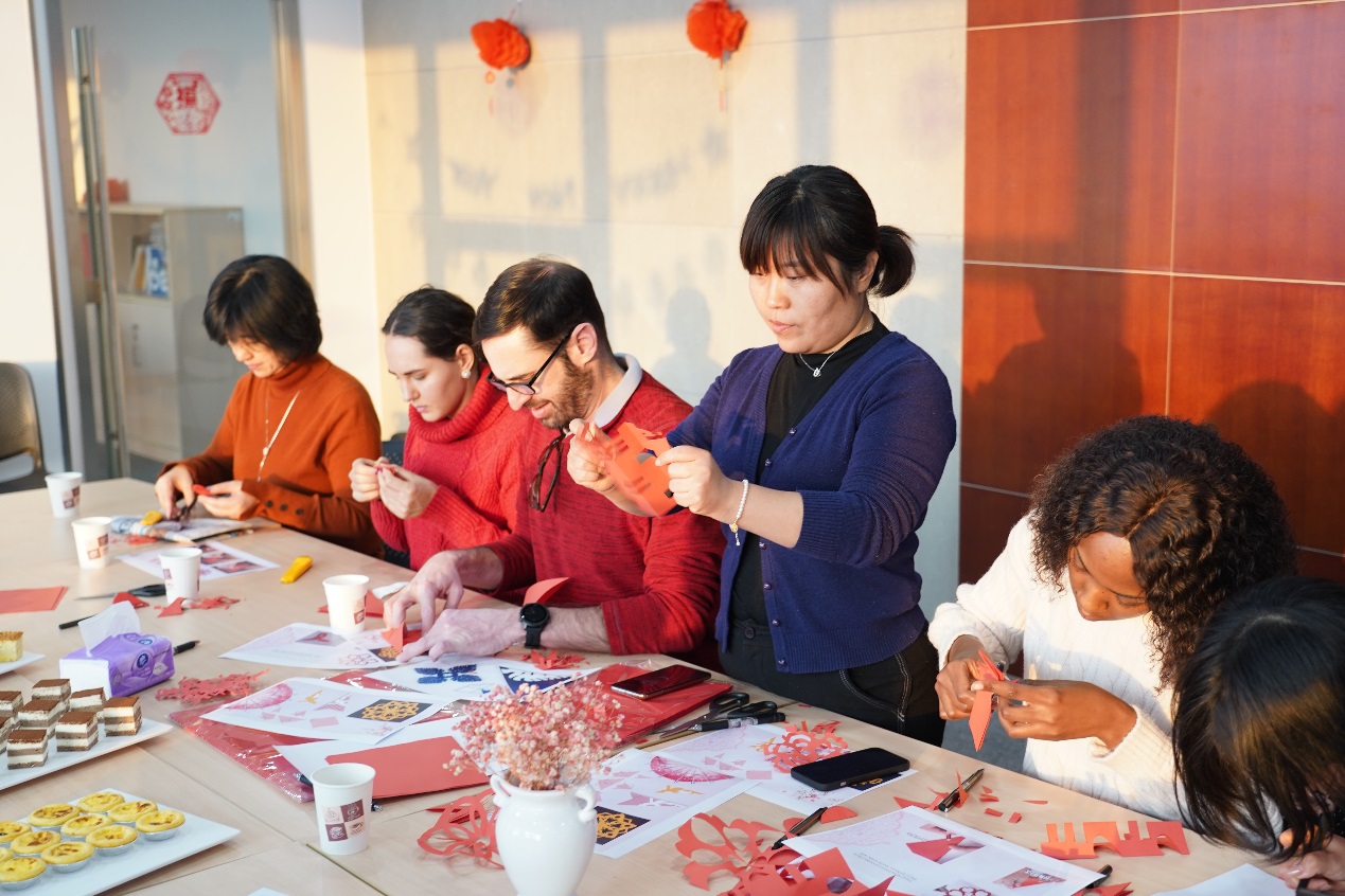 In order to help students understand Chinese culture and tradition, the main activity that the students participated in was Chinese traditional paper-cutting to welcome the Spring Festival. This cultural phenomenon plays an important role in the New Year celebration in China, and it was fascinating for international students to have an opportunity to learn more about this folk art. After the host, Zeng Yingxin, demonstrated the basic techniques of paper-cutting in detail, the students could not wait to experience it. Everyone was busy folding, drawing and cutting. The red paper in their hands transformed into Chinese characters for “spring”(春), “wealth” (福) and “happiness”(囍), as well as butterflies, snowflakes and plum blossoms. Astonished with the results, students exclaimed "Amazing, it's a miracle!" while demonstrating their works.