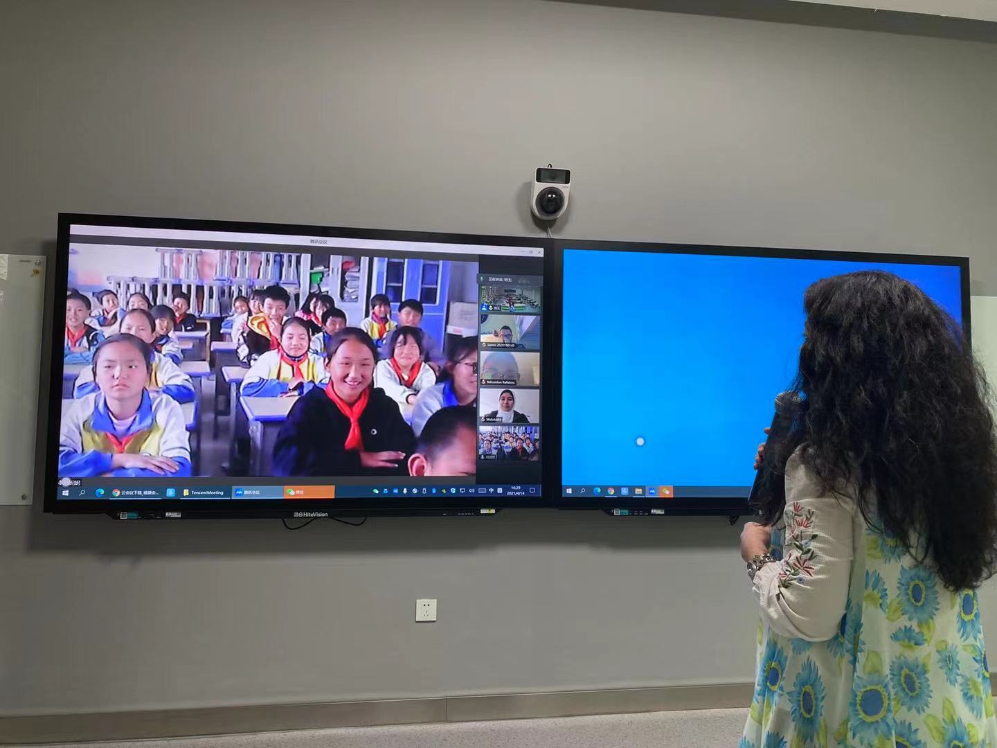 In order to consolidate the achievements of poverty alleviation and narrow the gap of educational resources between urban and rural areas and between the east and the west, Silk Road School organized SRS teachers and students from other countries and regions to help the students of Yinpan Middle School and Zhongpai Center Primary School improving their English level. On April 14th, the first meeting between the two sides was held online and offline simultaneously. SRS students from Pakistan, Bangladesh, Costa Rica, Ghana and Serbia gathered in Classroom 104 and gathered with the students from Ireland, Liberia, the United States, Cameroon, Sri Lanka, Italy and other countries and regions who could not return to school due to the COVID-19 epidemic. Together with the students of Yingpan Middle School and Zhongpai Center Primary School, they had a unique meeting.