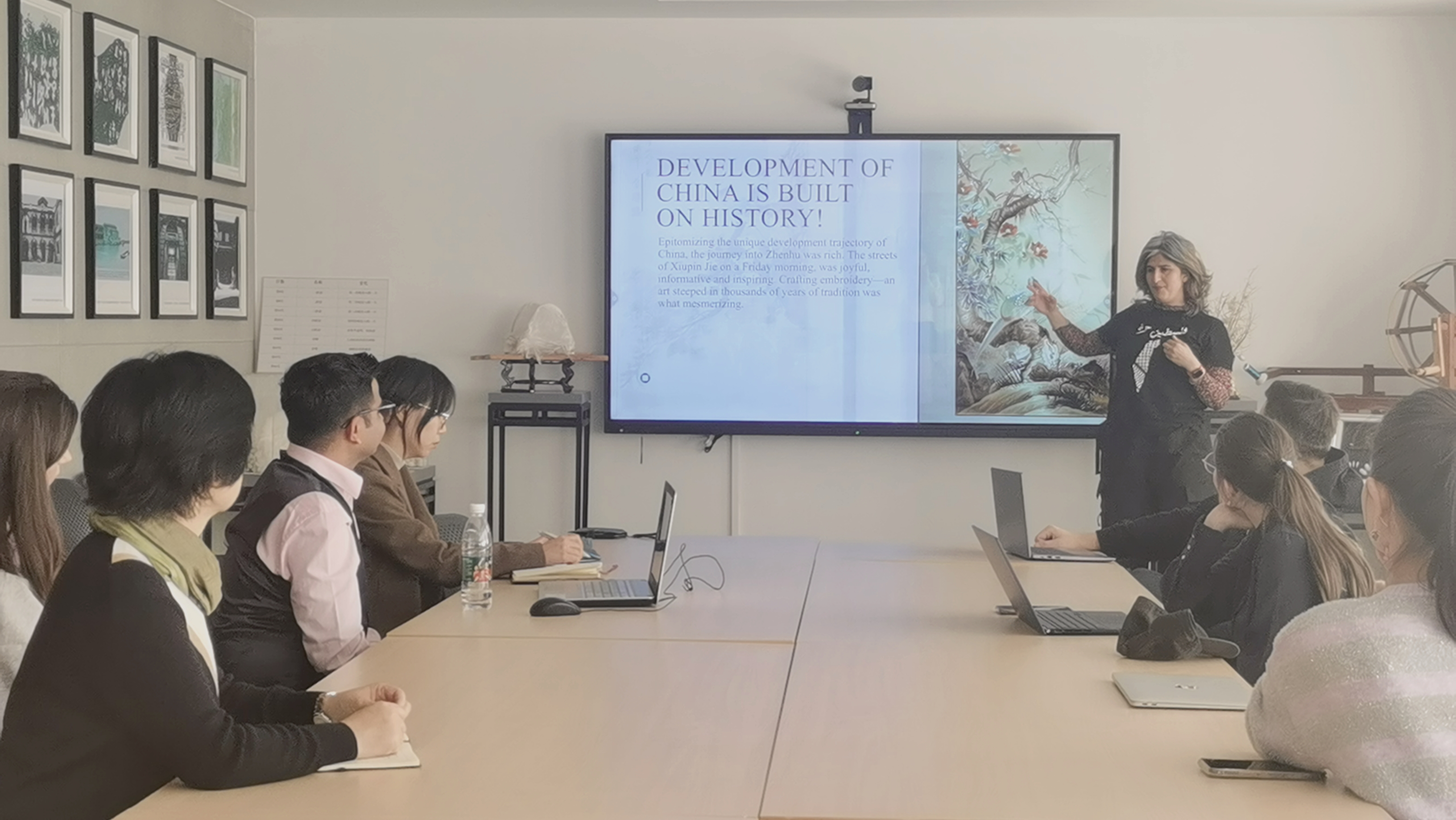 During the session, students presented insights from their recent filed studies. Talebur from Bangladesh and Nikifor from Russia reviewed their research on the Suqing Group, highlighting its contributions to air purification technology and water pollution control, and drawing inspiration from China's green economic policies. Additionally, Nahid from Australia and Shota from Georgia conducted comparative analyses, contrasting Su embroidery with their countries' cultural products.