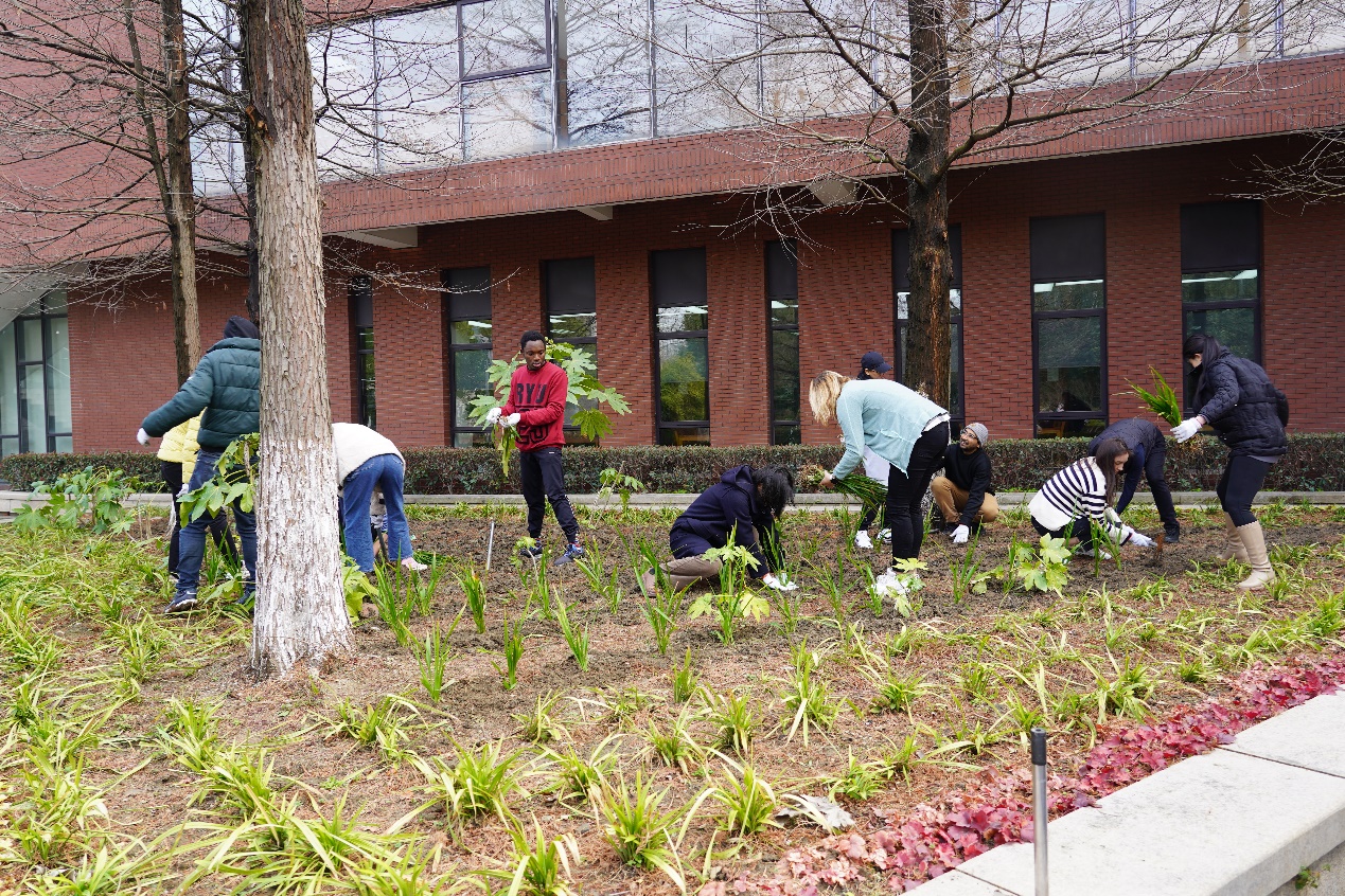 “Today we are going to plant auspicious grasses”, Mr. You Jikun, who taught them to plant said. After learning for a while, all of them mastered the skills and started to beatify the garden. Two by two, line by line, seedlings by seedlings, both teachers and students planted and filled the whole garden with auspicious grasses. It was finished earlier than expected because of everyone’s efforts.